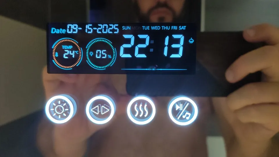 The integrated display keeps key info visible while you’re getting ready—helpful for staying on schedule and checking room temperature at a glance.